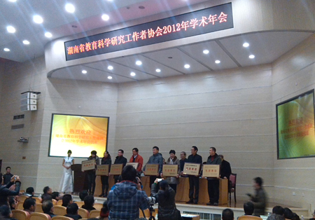 12月27日,湖南省教育厅在省教育科学研究工作者协会年会上对2011年-2012年度高等院校教育科研工作先进单位进行了隆重表彰。教育厅厅长王珂敏亲临大会并作重要讲话。我院荣获湖南省2011-2012年度高等院校教育科研工作先进单位称号,副院长龙伟、院校研究所常务副所长申晓伟参加了会议。此次评选活动由省教育科学规划领导小组办公室根据评选内容和条件对各单位申报材料进行严格审核,并组织专家评选,共评出中南大学等25个高等院校为教育科研工作先进单位。