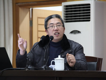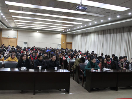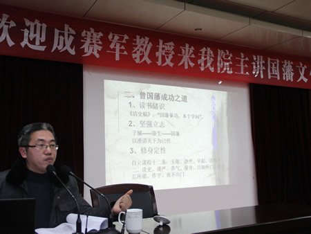 在随后的讲座中,成赛军教授从曾国藩其人其事、曾国藩成功之道、曾国藩对湖湘文化的贡献三个方面进行了讲述,旁征博引、深入浅出地诠释了曾国藩成长过程给人们的启示。成赛军还讲述了曾国藩修身、养性等方面的思想,与现代社会中的教育、用人识人等现实问题相结合,提出了曾国藩思想对现代人的借鉴意义和参考价值。成赛军教授风趣的语言和清新的讲课风格使在场听众受到了很大的思想触动和心灵启迪,不时报以阵阵掌声。