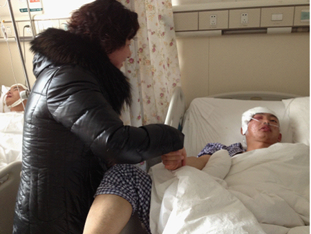在医院的病房里,罗丽萍首先转达了学工处处长张一军等领导的关心和问候。游新娥代表电信系全体师生将爱心款交到喻齐相父亲手中时,喻齐相及其父亲感动不已。坚强的喻齐相断断续续非常费力地说:“我相信在学院领导、老师和同学们的关爱下,我的病一定能够很快痊愈,我一定能尽快回到同学中间……回报社会……”让在场师生感动落泪。最后吴莲贵代表全系师生衷心祝愿他能早日恢复健康,尽快重返校园。(文/吴莲贵 图/吴喜平)