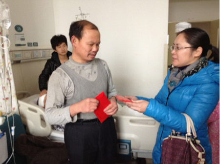 学院领导非常重视,副院长刘自斌亲自派车并嘱咐电信系领导为患病学子尽快送去祝福与捐款。1月9日上午,学工处副处长罗丽萍,电信系主任游新娥、总支书记吴莲贵、学工副主任李规、辅导员吴喜平及喻齐相同班同学等师生代表一行赶到湖南湘雅一医院看望于1月7日成功做完脑瘤手术的喻齐相同学,并送去募捐到的还存着师生员工体温的爱心款24998元。