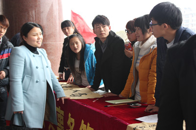 为宣传雷锋精神,增强学生学雷锋的意识,3月14日,公共事务管理系团总支组织志愿者在主教楼前举办了以“学雷锋精神,展公管风采”为主题学雷锋书法展作品赠送活动。