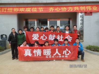 电信系学雷锋志愿者于3月15日在娄底社会福利院开展了“爱心献社会、真情暖人间”活动,参加本次活动有学工主任李规、辅导员梁飞翔、彭继光、李韶辉老师和12通讯班志愿者们。