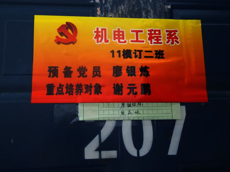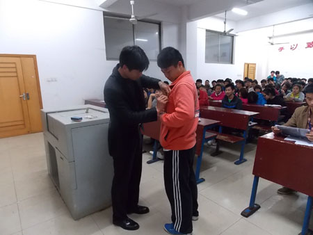 预备党员贺飞、廖银炼先后讲述了在志愿者活动月中大家的付出、自身存在的问题及今后的纪律。随后,申主任为预备党员代表谌遐和重点培养对象代表梁湘荣佩戴标识徽章并发表讲话:他肯定了大家在学习、工作及生活等方面起到的模范带头作用。他强调,为了让“示范工程”永不褪色,“党员示范工程”建设势在必行,他介绍了活动总体思路、实施办法,提出了明确的要求:系学生党支部为学生党员、预备党员以及重点培养对象量身定做标识徽章,系部以寝室为单位将与会人员的信息贴到寝室门上。他希望大家佩戴好徽章并维护好标识贴,接受老师及同学们的监督,时时处处严格要求自己,发挥先锋模范带头作用,让更多的学生加入到该项工程中来。