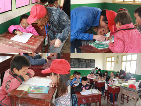 在志愿者们的帮助下填写《小读者调查问卷》