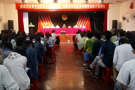 5月9日下午,我院在南苑礼堂举行青年马克思主义者培养工程暨业余团校第四期培训班开班典礼。我院党委副书记欧友佳、副院长刘自斌、院团委书记欧芳、各系部学工主任、各培训班带班老师和业余团校所有学员参加了典礼。典礼由刘自斌主持。
