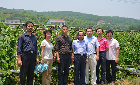 随后,周意坚一行来到我院2012级农民创业培训班学员张良丰的蔬菜基地。张良丰是印塘乡岳家村人,承包了100多亩田,2011年大规模种植香芋,由于销售不利亏损5万元。2012年到我院学习后,立即进行市场调查与预测,开展多种经营,2013年种植了一季稻、葡萄、黄瓜、丝瓜、油菜、辣椒等粮油果蔬作物,预计今年收入近20万元。同时,他还联合周边农户成立了专业合作社,开展规模经营,带领乡亲们共同致富。周意坚一行下到张良丰的基地,仔细查看了他的稻田、大棚蔬菜和露天蔬菜。当看到张良丰的去年种植的葡萄没有剪枝整形挂果很少时,周意坚随即致电我院葡萄专家曾玉华老师,要曾老师在适当的时候去张良丰的葡萄基地进行技术指导,同时,告诉张良丰要与我院的专业教师多联系请教。