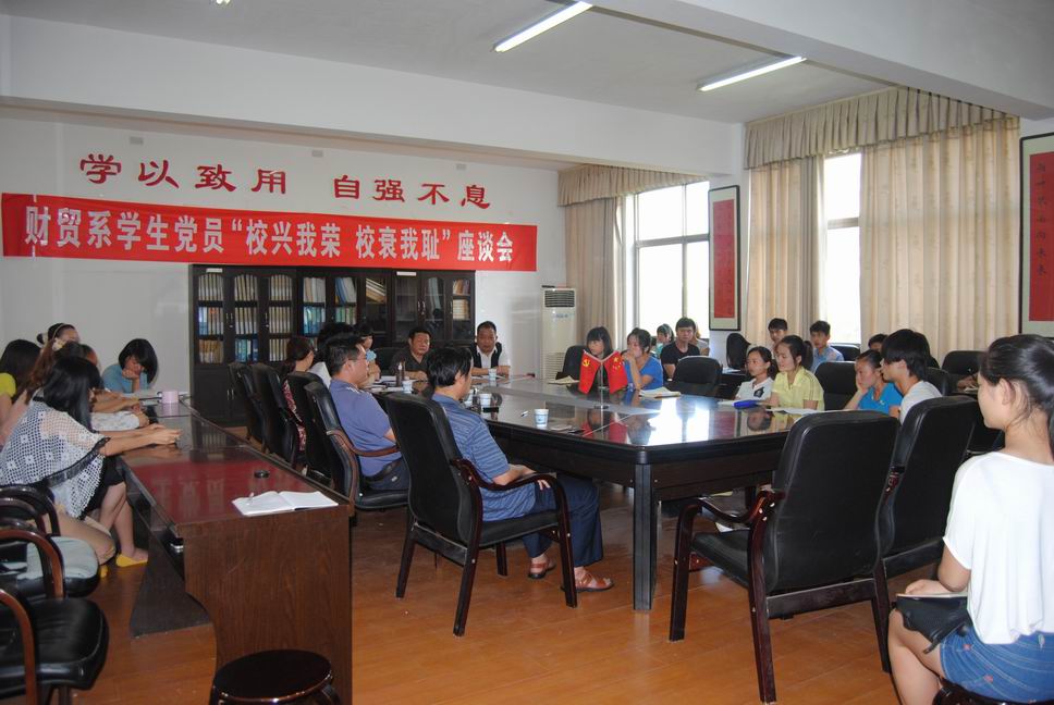 5月23日,我系学生党员在实训楼207室举行“校兴我荣 校衰我耻”座谈会。组织部部长刘高永、党总支书记蒋美群、学工主任刘媛、学生干事成柳才及财贸系全体辅导员参会。我系学生党员及入党发展对象参与座谈。座谈会由刘媛主持。