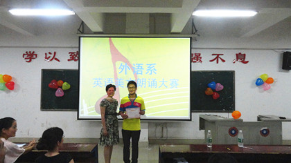 6月5日晚7点半,外语系英语美文朗诵大赛决赛在主教楼410举行,本次大赛的评委有系主任刘燕、教学主任肖付良、学工主任贺建良、教研室主任周萍、外教Daniel和Natasha。团委书记欧芳莅临现场观赛,外语系全体同学参加。