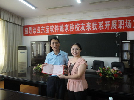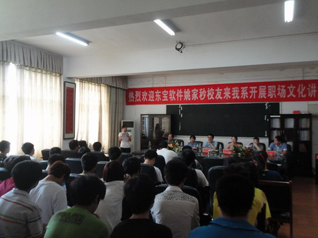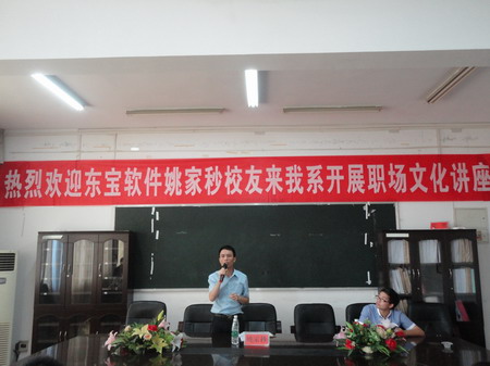 6月21日上午,深圳东宝软件公司姚家秒校友在实训楼207对电子信息工程系11、12级东宝软件订单班的全体同学开展了一场职场文化讲座,电信系全体系领导、软件教研室老师一同参加。