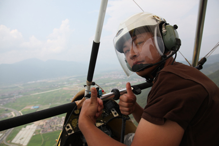 很小的时候,王强就迷上了蓝天,憧憬着有朝一日能自由翱翔在蓝天。很多人都有这样的童年梦想,但随着成长往往淡漠遗忘。王强说,自己非常幸运,有一位眼界开阔、知识面广、动手能力强的爷爷,一直鼓励他挖掘潜力,追求梦想。“机械世家”的遗传基因,加上自己的强烈热爱,令王强在爷爷的谆谆教诲中、手把手的教授下不断成长,初、高中时期每一次小发明小创作他都稳拿冠军。高二时,他通过看书、看视频,买回一堆铝合金、摩托车发动机、摩托车轮胎等零部件,自己摸索着组装、钻孔、焊接、上油漆等,用几个月时间终于做出了自己的第一架“飞机”。由于理论知识不足,材质和技术不过关,飞机发动后只能在地上滑行,始终无法起飞。不甘心的王强又先后做了两架飞机,还是没能飞上蓝天。“我一定能飞上蓝天!”倔强的王强在心中立下了美好的誓言。