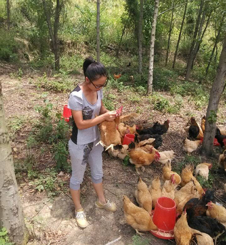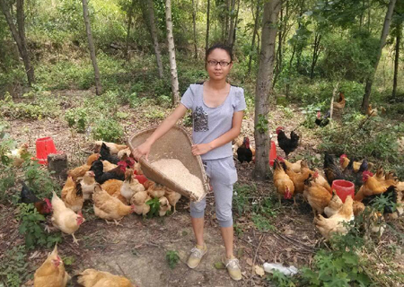 凭借在学校学到的养殖知识、在实训中掌握的养殖经验,在做过简单的市场调查后,依据新化的养殖环境特点、家禽市场需求,曾娜选择了养鸡。“现代人注重养生、保健,安全食品需求很大。新化大山多,污染少,水啊空气啊都很纯净,正适合绿色养殖。”因为资金有限,曾娜从风险小、投入不高的三黄鸡养殖开始起步。村里的文书被曾娜感动,免费让她在山上放养鸡,建鸡舍。鸡舍从选址到一砖一瓦地搭建,全是曾娜亲自弄的。鸡舍建在山脚,鸡舍的木材啊、旁边架电线、架水管这些事,全要靠自己想办法。用的木材得自己上山去砍,然后运下来。父亲义不容辞来帮忙,年近七十多的爷爷也积极参与进来。那时每天早晨6点钟一家子人从家里吃完饭上山,带点水果,中午饿了就吃水果,饭也吃不上。曾娜说,两个多月时间里累了就直接躺在地上休息,渴了就捧点井水喝,从清早开工到下午三四点,累得腿都提不起来了。在山上运木材的过程中,爸爸还曾经被树砸中受了伤,虽然没有大碍,但曾娜心中暗暗起誓,一定要把这个事干好,不然对不起爸爸,对不起家人和其他好心人的支持,也对不起自己的辛勤付出。