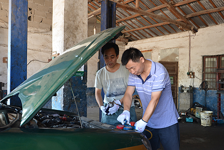 在永安汽修厂里,我院应用电子专业教师李和平、吴水平正在忙着检修刚上门的出租车。“自己是搞电子专业的,汽车行业发展迅速,需要多了解掌握相关的技术才行。刚开始好多东西不懂,在师傅指导下,已经修了好几台车了。”