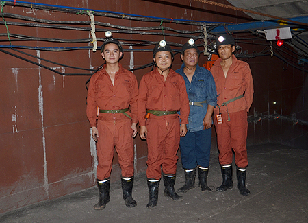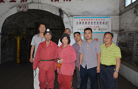 在丰华煤业公司石坝井煤矿,我院煤矿专业教师贺保平、蔡翰庭、李明杰与我院毕业生、在该矿上班的刘双正就今日井下状况进行交流。“这里矿区比较成熟,管理也很规范。我院多名学生在这上班,从事通风、机电方面技术工作,毕业生唐斌更是担任了技术组组长。”贺保平等人介绍说。