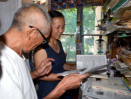 痴迷读书的林老先生一生清贫,然其私人藏书却多达3万余册,买书和写文章已成为林老生活的重要内容之一。“我爱剪报。”林蒲田撩开一扇布帘,简单的木架书柜上分门别类地罗列着他几十年积攒下来的剪报。“时事政治,社会热点,专业技能,生活窍门……凡是我认为有用的都会一一剪下来,一本一本粘好,很方便阅读。”林老还向大家逐一展示了他的“一柜子国学经典”、“一柜子人物传记”、“一柜子古今字典”、“一柜子专业书籍”……,让他深以为自豪的是,他收藏的最古老的书出自光绪乙未年间(公元1895年),迄今整整118年。大家都被林老的博学、好学、善学深深打动,李文莲动情地说:“林老的物质生活上是清贫的,但在精神生活上是非常富有的。”