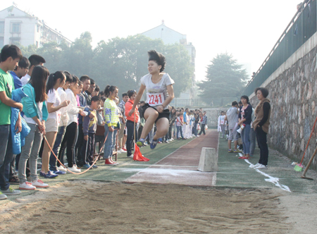 财贸系学生刘丽花,在女子跳高比赛中一举打破院运动会记录,实现了我院竞技体育的又一突破。“全班同学为我加油,为我服务,不破纪录都不行啊。”