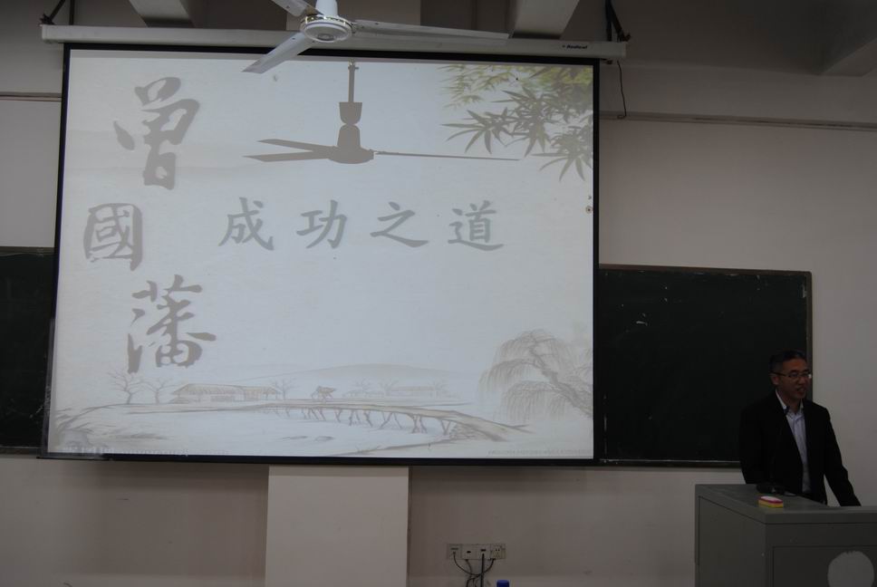 财贸系于10月24日晚特邀请人文科技学院成赛军副研究员为师生主讲“曾国藩成功之道”专题讲座,财贸系党总支书记蒋美群、学工主任刘媛、全体辅导员老师、200余名班团干部以及其他院系部分学生参与了讲座。此专题讲座在主教楼110举行,由学工主任刘媛主持,并要求辅导员和学生干部们认真学习,将精神贯彻到每一位学生。