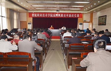 10月31日,为认真贯彻落实习近平总书记关于各级领导干部要带头反对“形式主义、官僚主义、享乐主义和奢靡之风”四风的指示精神,落实娄底市纪委关于娄底市党政领导干部廉洁自律的制度,我院在主教学楼报告厅举行“反四风做表率”廉政党课,院党委书记李文莲为全体党员干部上了一堂生动的知识分子坚守气节操守的党课。