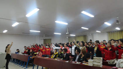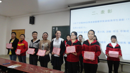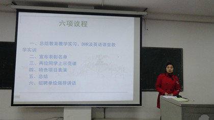 11月18日晚七点,外语系11级应教专业教学法实习、DHR及英语课堂实训总结表彰及汇报会在主教楼610召开。出席大会的有系主任刘燕,教学主任肖付良,学工主任贺建良,指导老师龚文锋、周志军、谢杰,辅导员周春红,招聘单位校长兰晓峰、曾婷,11、12级应用英语班及13级全体学生。