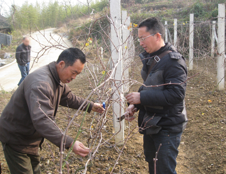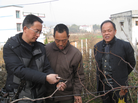 涟源市石马山镇南山村的刘细堂,原来家里主要种植水稻、西瓜、香瓜,用他的话说“每年打得万把斤谷,收入万把块钱”,刚够维持一家人的生活。2011年刘细堂参加创业培训回乡后便开始种植了600多株葡萄,主要有“巨玫瑰”、“茉莉香”、“香悦”三个品种,种苗由学院的老师赠送,种葡萄刚开始劳力投入不大,但技术上要求高,所以经常向老师请教是必须的,学院的果栽专业副教授曾玉华老师多次去刘细堂的地里,细心地指导刘细堂如何培育壮苗、病害防治和田间管理等技术,今年已经挂果并且取得了一定的经济效益,这次曾玉华老师送去了葡萄冬季修剪和立柱搭架等关键技术,预计他的葡萄园明年进入盛产期,刘细堂对此充满信心。
