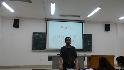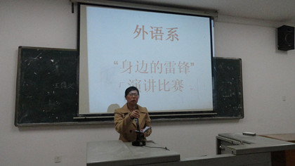 为了学习雷锋精神,弘扬中华的传统美德,外语系于3月30日晚7点半在主教楼620举行了“身边的活雷锋”演讲比赛。学工主任贺建良、辅导员周春红出席比赛并担任评委。外语系全体同学观看了此次演讲比赛。