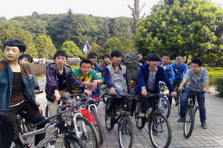 中午1点,13应电班的志愿者们集合完毕,每人骑着一辆自行车,有的同学在自己车前悬挂了国旗,随后同学们打着横幅有组织有秩序地骑车慢行至珠山公园,并在珠山公园内绕行二圈,沿路向行人做保护环境的公益宣传。志愿者们发现路边有矿泉水瓶和垃圾时就会主动进行清理,发现草坪上坐着年轻人在吃零食时也会善意的提醒。