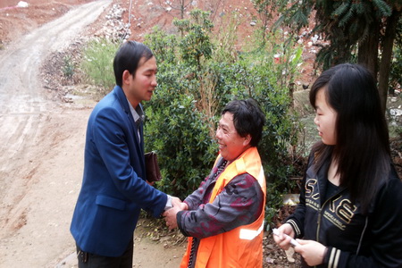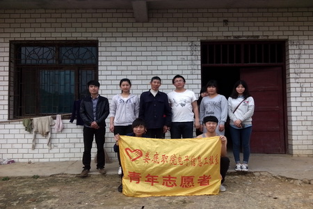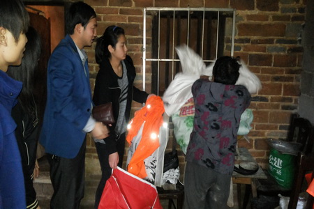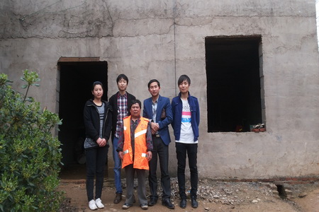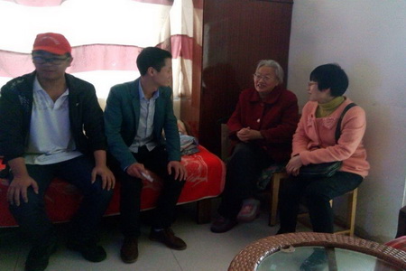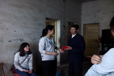 本次活动是由12动漫班颜震宇发起,一进到了老人家里,志愿者们心里都很激动,赶路的疲倦之意顿时没了,心里多了几分怜惜。向老人简单说明我们的来意后,他微笑的点着头,当我们将带来一些水果和慰问金递给老人时,老人用手拉着志愿者们反复说着“谢谢”。爷爷很热情,手忙脚乱的到屋里又是搬凳子又是倒水、拿花生。爷爷不断用家乡话讲述着自己的故事和他年青时代的生活和艰辛,从聊天中得知老人家里有两个女儿,一个儿子,儿子小时候因病去世,大女儿出嫁在西藏那边,因为路途遥远几个月才能回来看望一次,小女婿为人不正现已离家出走。另外爷爷还有一个孙子,十七岁现读高二,家庭经济来源仅靠女儿外出打工来维持。老人说到家事时多数是面带微笑,只偶尔低着头沉默一会,他的乐观打动了我们每一个人。
