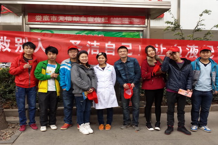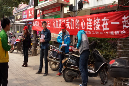 为了更好地弘扬和宣传当代大学生乐于奉献和关爱他人的高尚精神,为我市中心血站贡献尽一份绵薄之力,电信系12通信班继去年3月开展了义务献血宣传活动后,今年3月22日,12通信班的志愿者们又来到了娄星区氐星路九龙前坪开展“无偿献血”的义务宣传活动。
