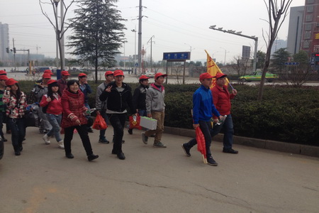 一清早,2个班的环保宣传志愿者队兵分二路,12应电班的志愿者们戴着小红帽,举着志愿者旗和十多块班级自制的环保宣传旗从学院出发,途经石马公园、火车站、新一佳等地进行了宣传活动,并在石马公园开展了“万人齐参与、共建新娄底”市民签名活动。12计网班的志愿者们则选择往娄底市体育馆广场,今年8月份,省运会将在我市举行,而整个体育馆将成为大家的焦点,志愿者们拉起了“九州大地整新容,雷锋遍地开新花”的横幅在广场中进行宣传,看到地上有垃圾时志愿者都会随手捡起。一路上,两支志愿者宣传队伍吸引了广大市民的目光,活动也得到了市民们充分的认可和支持。