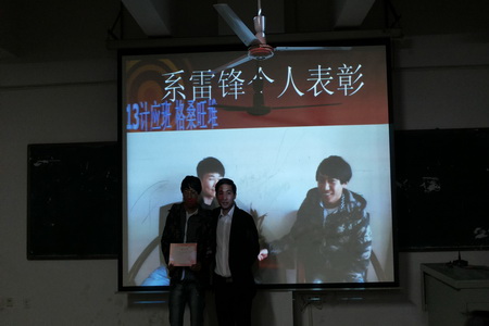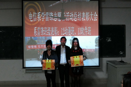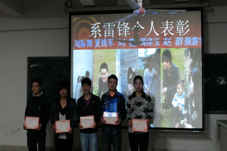 为了总结和表彰3月学雷锋志愿者活动突出班级和个人,电信系于4月2日晚上在主教学楼510举行了学雷锋志愿者活动总结表彰大会。电信系学工主任李规、学工干事佘彬、辅导员梁飞翔、李韶辉与全体系、班团干部参加。