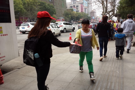 上午9点左右,志愿者们到达目的地,与中心血站工作人员交流后随即开展起活动。志愿者们在献血车旁挂起了“拯救别人,圣洁自己,让血液把我们的心连接在一起”横幅,并迅速分工投入工作,一部分同学留在献血车内协助来献血的人填写相关表格,一部分在周边对过往的市民发放“无偿献血”宣传册。