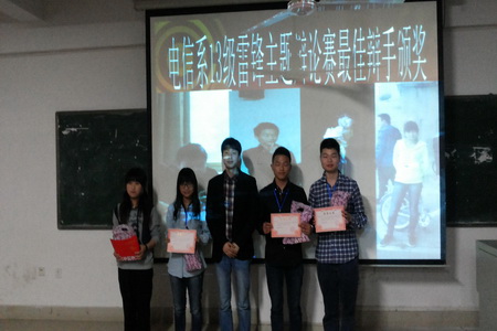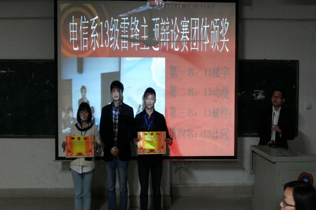 为了丰富同学们的课余生活,开展好相关学雷锋志愿者活动。电信系于3月31日晚上在主教学楼510举行了13级学生雷锋主题辩论赛的决赛。电信系学工干事佘彬与辅导员梁飞翔和李韶辉老师担任了决赛评委,全系2013级全体学生参加。