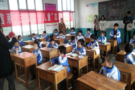 一走进湘中文武学校,我们便得到了原创集团和学校领导的热情接待。学校普教部姚主任将我们带到小学一年级1班教室并致欢迎辞,在班主任肖华兴老师的介绍下,大家与班上29位小朋友见面了,当知道我们的来意后,全体小朋友报以热烈的掌声,其中有三位小同学还流下了激动的眼泪。李规代表电信系全体学生给小朋友最亲切的问候并把精美的文具盒、铅笔等学习用品以及一大箱零食等礼物分送给了每一位小朋友。