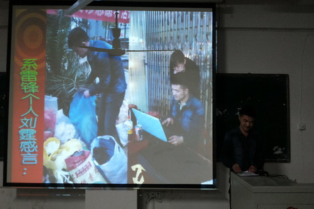 本月的主题班会和晚自习上,各班大多选用如“雷锋的生平事迹”、“学习雷锋精神”等相关学雷锋的主题开展班会并讨论。辅导员通过PPT和同学们相互学习,并要求同学们将言行一致、不图名利、始终如一、无私奉献的雷锋精神应用到自己的生活和学习中。通过主题班会,不仅让同学们了解到雷锋的一些生平故事,还学习到了雷锋那种艰苦朴素、全心全意为人民服务的“螺丝钉”精神。