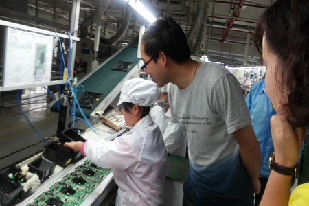 李规首先来到位于深圳市宝安区石岩镇塘头工业区的创维科技工业园区,我院有49位2014届毕业生在创维顶岗实习,其中有44位是应用电子专业的学生。李规在公司人力源部王田甜的陪同下与20位同学代表进行了座谈,同学们纷纷介绍着自己在公司的工作和生活情况以及实习的感受等。11电大2班方坚介绍,他现在与其他6名同学被分到了自动化设备部设备管理科工作,有双休日,工作环境也很好,觉得能学到很多与专业对口的知识,月实习收入也在4千元左右。随后,李规来到生产线和宿舍看望了其他同学,并鼓励他们要珍惜实习机会,提高专业技能,并着重强调了顶岗实习期间的安全问题。同学们对学院老师的到来感到很亲切,也纷纷表示会珍惜这个宝贵机会,努力学习和工作,提高技能操作水平。
