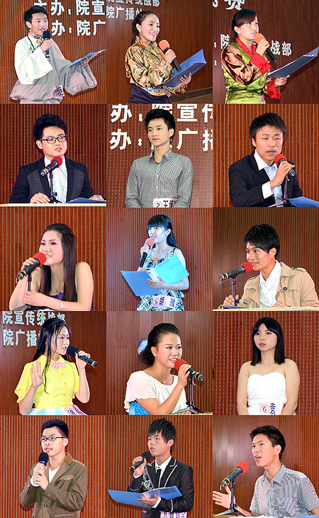 大赛在活力四射的开场舞后拉开帷幕,本次比赛分为“自我介绍”、“模拟主播”、“才艺展示”三个环节,在全院几千学子中脱颖而出的15名选手参加了三个环节的角逐。“自我介绍”环节选手们通过新颖的T台秀形式出场作自我介绍,靓丽的外形、出色的音质博得了现场阵阵掌声。“模拟主播”环节选手们别出心裁,通过新闻主播、娱乐主播、电台主播、列车主播等各种形式充分展现了自身的主播风采,得到评委们的一致好评。“才艺展示”环节选手们载歌载舞,各展所长,现场掌声、欢呼声连绵不绝。