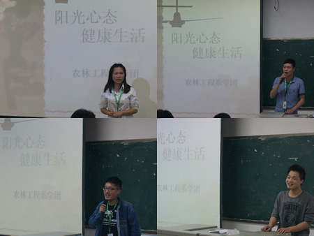 5月12日早,农林系于新培训楼前举行第九届“5.25心理健康教育节”启动仪式,该系副主任易瑜,学管干事颜勤,辅导员王琦、朱静姝、徐艺和全体同学出席启动仪式。 该系学团心教部杨聪迪部长宣读了活动倡议书,她倡议“给心灵多一份关注,给自己多一点勇气,给友谊多一点温暖”。易瑜安排布署我系心理健康教育节的工作,简要介绍了将要举行的系列活动。她提出健康的人生应该保持豁达宽容、平和宁静、积极乐观的心理。健康的心理是可以通过自己的理想、价值观和生活态度的调整,不断培养自己的进取心和挫折承受能力获得的,提高自我和谐、人际和谐及与社会、自然和谐相处的能力,怀着积极的心态去认识生活意义,热爱生活,这样的人生才有意义。 ![]() ![]() ![]() ![]() 征文比赛 为更好的普及大学生心理健康知识,传播心理健康理念,使大学生更加关注自己和他人心理健康,提高自身心理健康水平,农林系于5月12日至20日成功举办了心理健康征文比赛。 学院本次心理健康征文以“关爱自己,关爱朋友”为主题,目的是全方位反映当代大学生的学习生活,走进身边人的内心世界,培养大学生健康,积极,上进的人生态度。在此次征文中同学们热情抒写青春的激情,挥洒生命的脉搏。作品不仅对当代大学生心理健康问题做了深刻的分析,而且强调了心理健康在大学生日常生活学习中的重要性,观点鲜明,立意独特。经过严格评审,来自12园林(设计)一班任莉的《愿我的世界总有你的二分之一,一起同行》、12园林(工程)班耿岳的《青春-朋友》等在众多参赛作品中脱颖而出,被推荐参加学院第九届“5.25大学生心理健康教育节”有奖征文活动。 本次活动同学们参与意识高,作品内容生动健康,题材广泛,进一步增强了大学生的心理健康意识,普及了心理健康知识,优化了同学们心理品质,取得了积极的成效。(易非 管皓云) 心理宣泄会 5月21日晚,农林系于主教楼510召开以“阳光心态,健康生活”为主题的学团干部心理宣泄会。出席本次会议的有学工处副主任易瑜,学管干事颜勤,系学团全体干部,各班班团主要干部。 活动之初,大家一起观赏了由学团干部表演的来源于自己真实生活的心理情景剧《生活里的哪些事》,原汁原味的三个情景表演引起了台下各级学团干部的共鸣,赢得了热烈的掌声。 观剧之后,各级学团干部积极上台发言,倾诉工作中遇到的各种不理解、不配合,如:男女生部干部们说到,查寝查卫生时同学们的不配合,因查晚归夜不归时不得不晚睡等烦恼;体育部、学习部干部们表示查操、查堂也不是件简单的事……大家纷纷表示面对各种各样的工作问题时,作为一名干部愿意以身作则,说出自己的难处,希望得到班团干部们的配合以便系学团工作能更好的开展。12畜牧一班班长周恭勋、12畜牧二班班长仁青曲增分享了做为班长所承受的来自学管和学生的双重压力,真诚向在工作中承受了自己负能量的系学团干部们表示感谢和道歉,在以后的工作中发现问题时,尽力去解决;当自己有情绪有烦恼时,学会去寻找自己的调节方法。 会议最后由学工易瑜总结: 心理键康是衡量大学生综合素质的一个重要方面,随着社会的发展变化,大学生心理健康状况受到越来越多的关注。作为大学生中的特殊群体,学生干部的心理状况更应受到重视。大家除了要面对学业压力、就业压力,此外,还有老师、同学交付的各项工作,以及各种活动和各种评比。从某方面来说,活动和评比的结果代表了学生干部的工作成绩,这样造成大家要面对多重压力,比普通同学的压力更大,更容易出现诸如精神高度紧张、焦虑、抑郁、恐惧等各种心理问题。所以,今天我们来开一次“情绪宣泄会”,把平常工作中受到的委屈、不理解、压力都发泄出来,然后重新以积极饱满的精神状态继续“上路”。 离开会场时,大家步履轻松,相信我们能如易主任所愿:积极饱满的继续上路!(易瑜 耿岳 谢冬燕 管皓云) ![]() 情景剧表演 ![]() 系学团干部们倾诉 ![]() 各班团干部们发言 ![]() 易瑜讲话 ![]() 会场 | |
