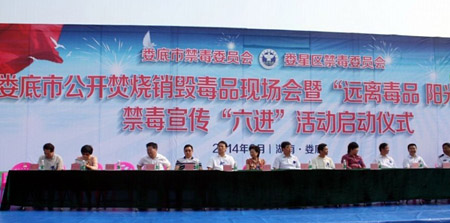 娄底市委、市政府领导,群众代表,学生代表,禁毒志愿者,“妈妈禁毒联盟”妇女代表,娱乐场所等行业代表5000余人参加了此次启动仪式。活动现场由民警公开焚烧销毁了全省近年来缴获的部分毒品共计120余公斤。(刘艳)