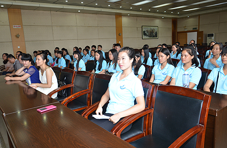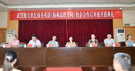 9月1日,我院校企合作商务英语订单班-武汉海天世纪2014级商务英语(海乘、高铁方向)订单班开班。院党委书记李文莲、党委委员、副院长龙伟、周志和、武汉海天世纪船务有限公司副总经理余立鹏、武汉海天世纪湖南分公司经理周文波、我院教务处处长游新娥、招生就业处处长戴志鹏、外语系主任刘燕、副主任肖付良、贺建良及商务英语教研室教师,海乘班全体学生参加了开班仪式。