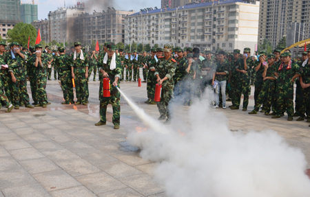 应急疏散演练结束后,参演人员还在指定地点进行了灭火实地演练,军训教官们为大家讲解了灭火器材的使用方法并组织学生进行实地灭火演练。