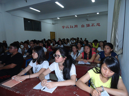 9月9日晚7点,外语系新生《学生手册》学习讲座在主教楼406举行,学工主任贺建良主持,辅导员周春红、助理班主任以及14级全体新生参加。