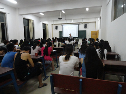 9月4日晚7点,外语系2014级新生专业教育讲座分别在主教楼411、406举行,系主任刘燕,学工主任贺建良,教学主任肖付良,辅导员周春红老师,教研室主任谢杰、谢丹和助理班主任参加,2014级全体新生聆听了讲座。