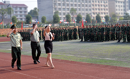 院党委书记李文莲在娄底市武警支队政委伍汉华、院武装部部长张明陪同下阅兵,与新同学们亲切互动。