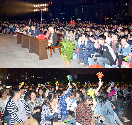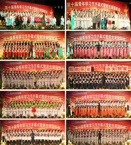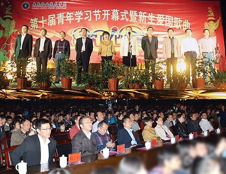 10月13日晚,一首首脍炙人口的爱国歌曲在我院文化广场上空回响,新生们身着亮丽的服装,用饱满的精神、嘹亮的歌声迎接我院第十届青年学习节的到来。市委常委、宣传部长伍美华,我院院长雷立成在开幕式上作重要讲话,院党委书记李文莲主持仪式并宣布第十届青年学习节开幕。院领导颜彩飞、龙伟、周意坚、刘自斌、邹松建、郭广军、周志和、梁凌洁出席,各系部处室负责人及全院学生共同参加开幕式并观看了歌咏比赛。