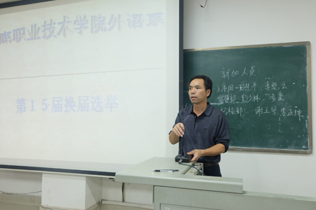 10月14日晚7:30,外语系在主教楼620举行第15届学生会换届选举,学工主任贺建良、辅导员周春红及全体学生参加了换届选举。大会由罗丹主持。