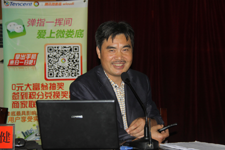 王建明代表娄底市电子商务协会致辞,腾讯微云娄底运营总监邹曙光介绍了目前娄底区域内微信的发展情况。