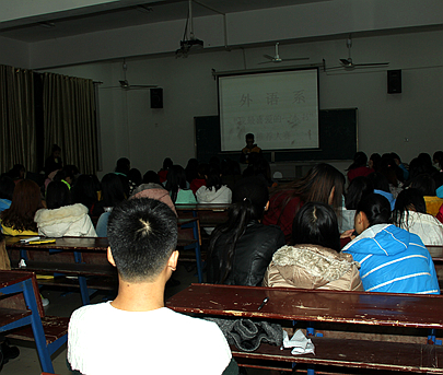 为了丰富同学们的文学知识,11月23日晚七点外语系于主教楼318举行关于“我最喜爱的一本书”推荐大赛,观摩比赛的有外语系学工主任贺建良、辅导员周春红及外语系全体学生,本次活动由参赛学生进行演讲。