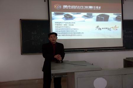 刘罗仁向同学们介绍了湖南省软件测评中心的情况:该软件测评中心是湖南省最早从事信息系统设计、检测及质量保障技术研究的科研机构之一,也是中南地区首家从事于第三方信息系统测试和品质保证的专业公司,获评为国家认可实验室。是一个在全国都有名的专业从事于软件设计、软件检测、信息技术共享、人才培养的公司。