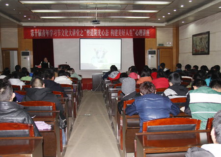 12月9日晚,第十届青年学习节文化大讲堂之“塑造阳光心态,构造美好人生”心理讲座在主教楼学术报告厅举办。本次讲座由团委书记欧芳主持,邀请了我院资深心理健康咨询师阳帆主讲,全院各系部心理委员、院系心理健康教育部干部到会聆听。