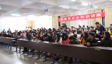 12月16日,财贸系于主教楼110教室开展大学生安全知识讲座。学工主任阳娟、学工干事姚凌虎、谭鹏飞、辅导员、14级各班干部参加讲座,本次讲座由保卫处处长张明主讲。