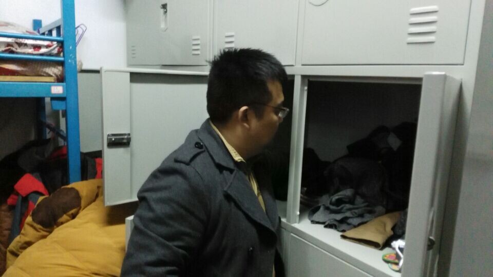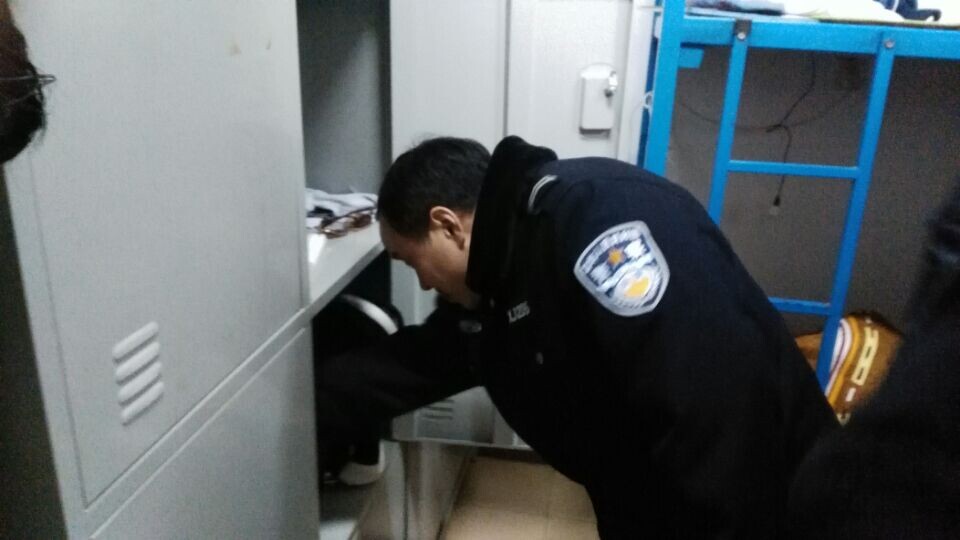 保卫处老师察看宿舍安全情况